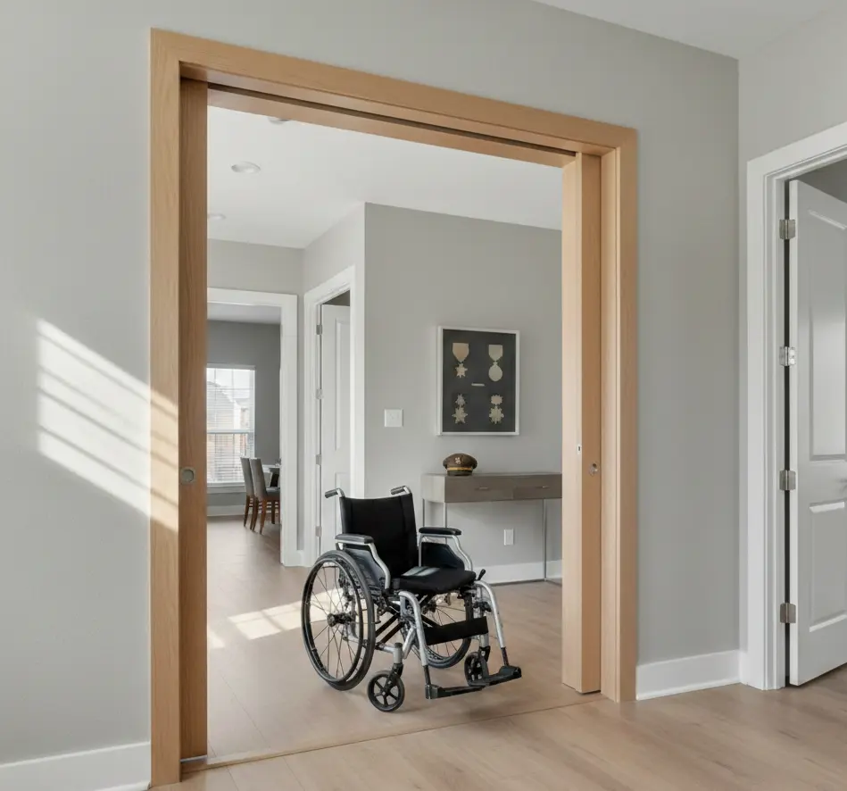 Wheelchair access commonly aims for wider clear opening and easier maneuvering. The wider you go, the more likely you trigger additional framing and finish work especially in bathrooms where space is tight.